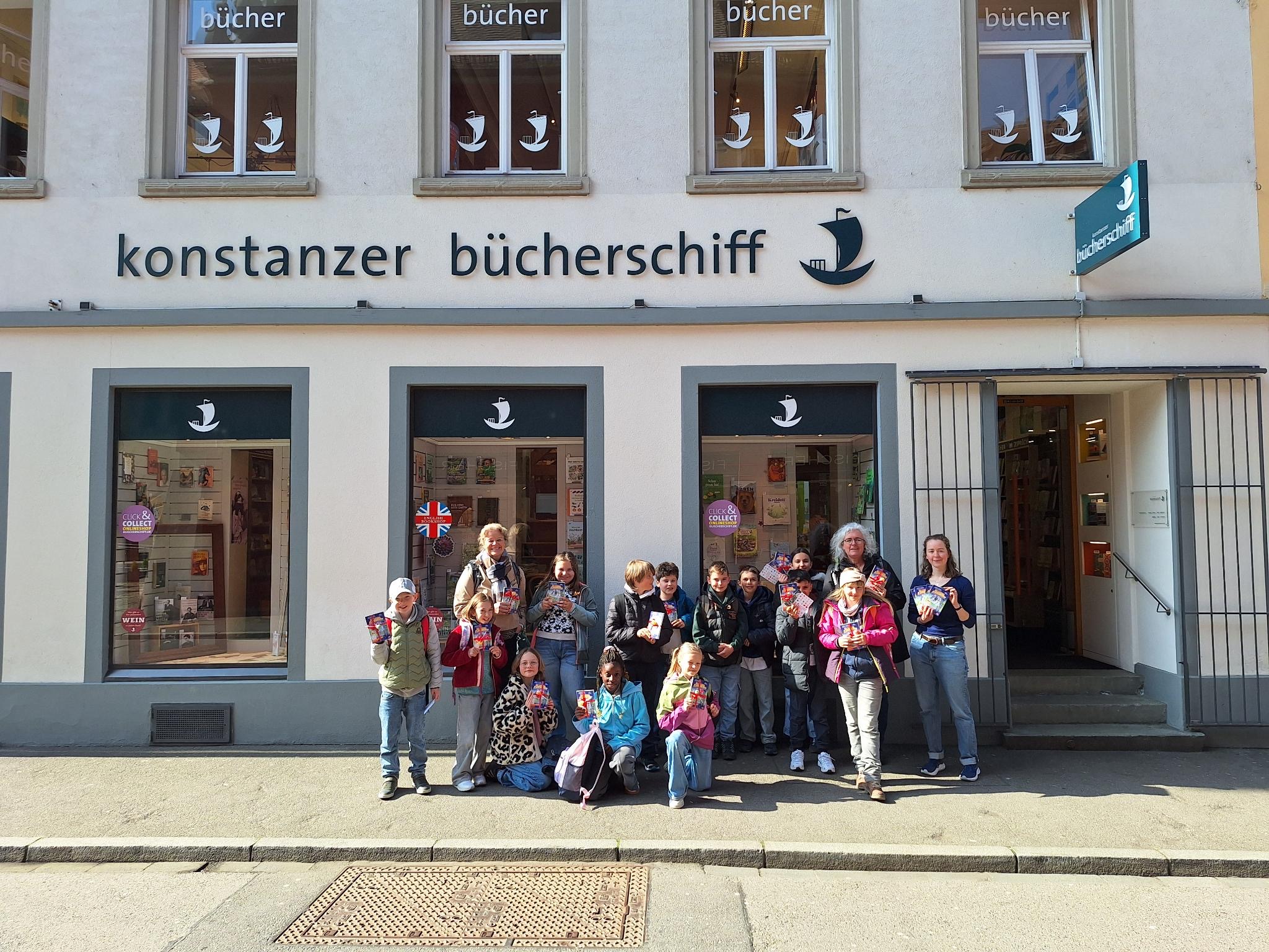 Die Klasse 4a besuchte die Konstanzer Buchhandlung Bücherschiff und erlebte dort einen spannenden Vormittag rund ums Buch. Anlass war der Welttag des Buches, an dem Buchhandlungen in ganz Deutschland Schulklassen begrüßen und ein besonderes Buch verschenken. In diesem Jahr heißt es „Der fliegende Klassenscooter“ – geschrieben extra für diesen Tag.